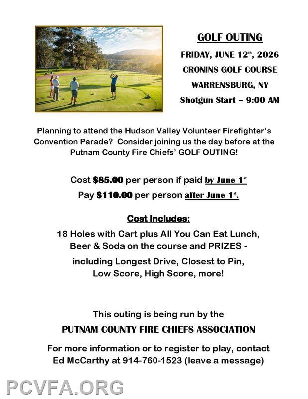 If you'll be in the Lake George area that week for the Hudson Valley VFA Convention Parade and like to play golf, consider contacting Chief Ed McCarthy for more details and to register for this fundraiser!