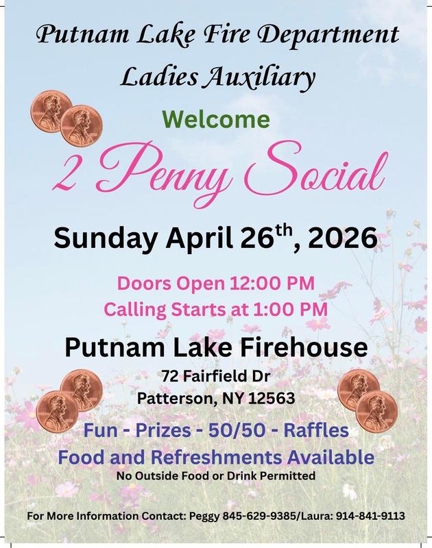 Penny Social lovers, get ready to head to Putnam Lake Fire Department where the PLFD Ladies Auxiliary will welcome you to its annual Spring fundraiser! Doors open at 12:00p - calling begins at 1:00p. Details and contact information can be found on the flyer!