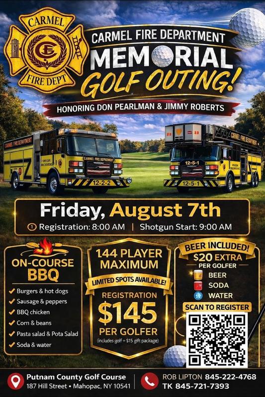The Carmel Fire Department will hold its annual "Don Pearlman & Jimmy Roberts" golf outing on Friday, August 7th. There's a 144-player maximum, so register early to secure your spot! See flyer for full details, QR code for registering and contact information!